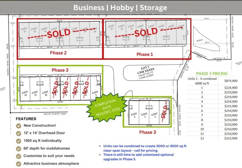 Our units boast 1500 square feet of space, 25 feet wide, with a depth of 60 feet, featuring a 12x14 high overhead door for convenient access.