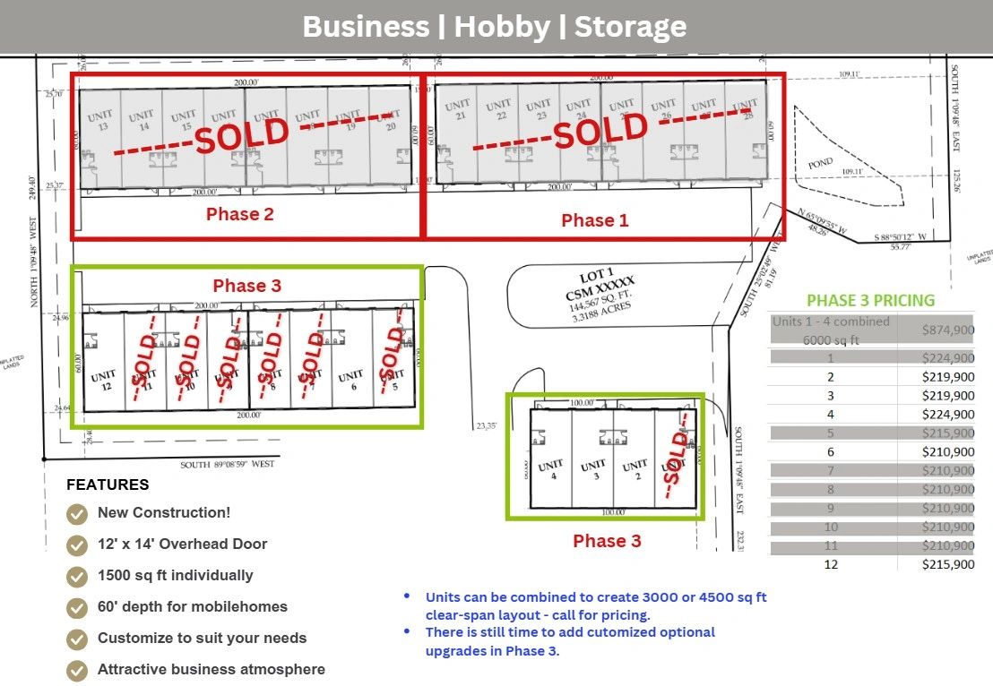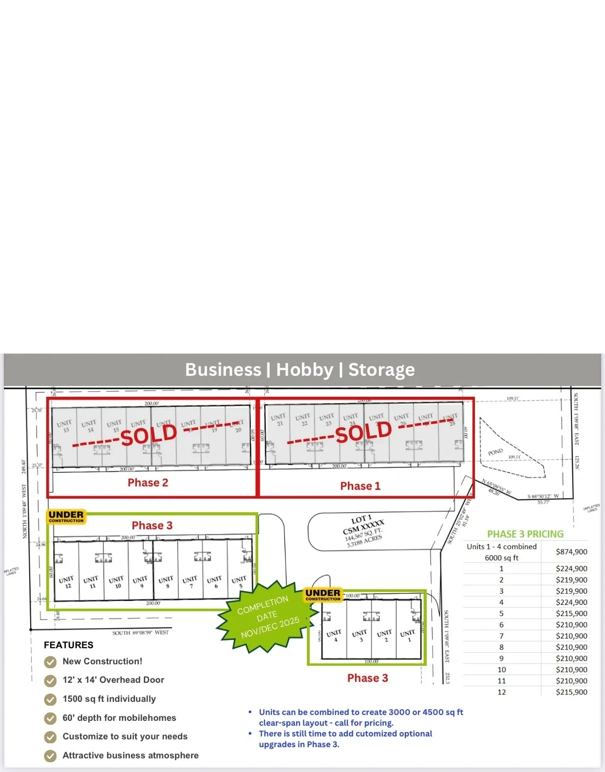 Our units boast 1500 square feet of space, 25 feet wide, with a depth of 60 feet, featuring a 12x14 high overhead door for convenient access.